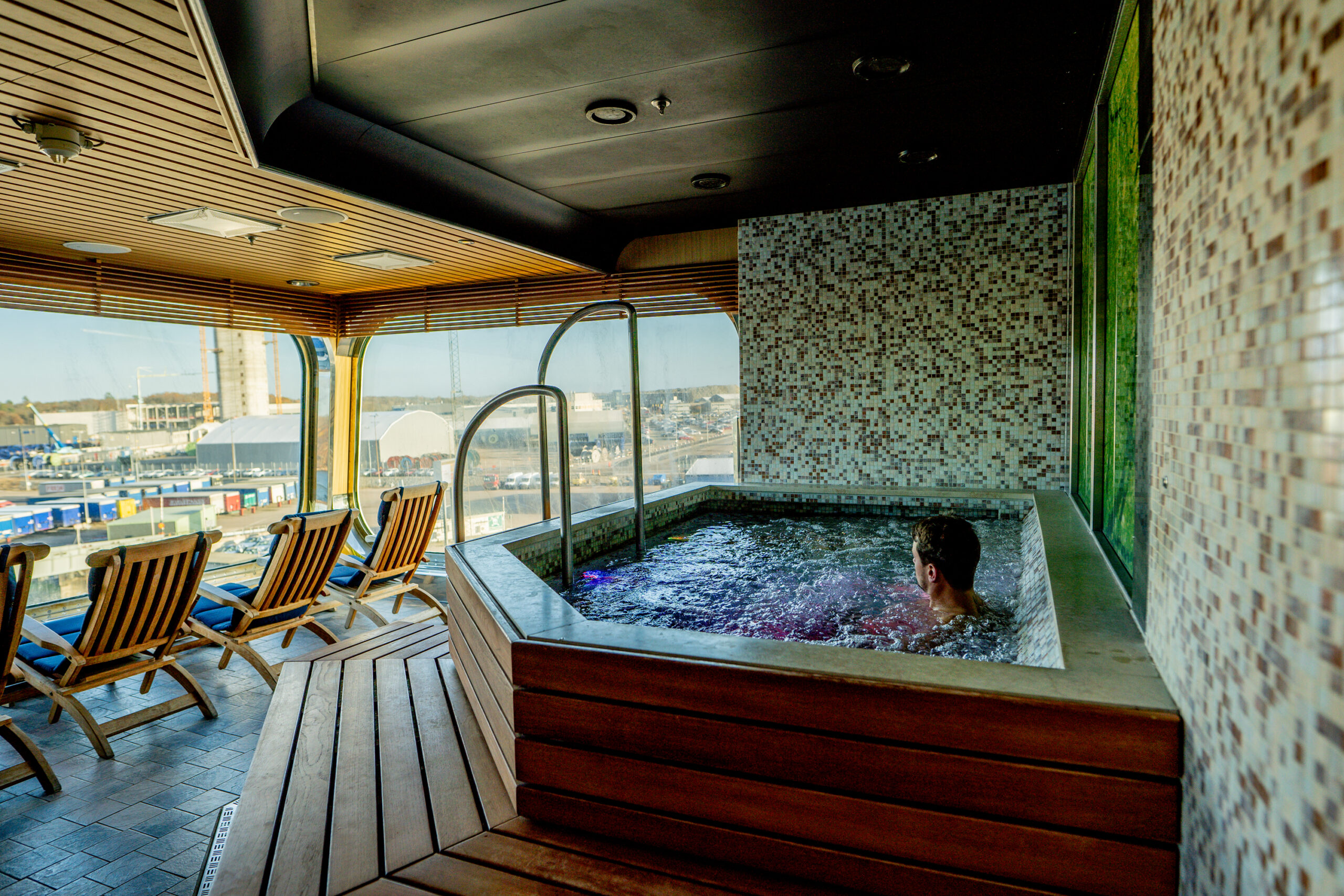 Leżaki z widokiem na morze – idealne miejsce do relaksu, gdzie przez przeszkloną ścianę możemy podziwiać fale i krajobrazy.
